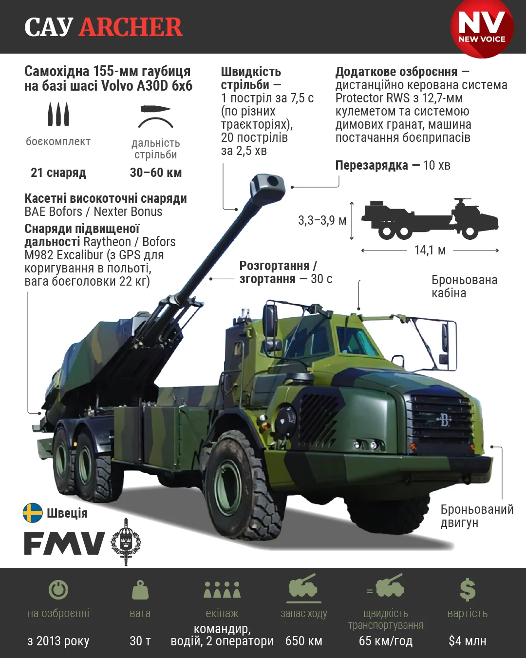 Archer — шведская 155-мм самоходная артиллерийская установка, которая появилась на вооружении Швеции менее 10 лет назад. Эти САУ изготавливают на базе шасси Volvo A30D 6×6. Ее дальность стрельбы — до 60 км (если используются снаряды Excalibur). Может осуществлять 20 выстрелов за 2,5 минуты и двигаться со скоростью 65 км/ч. Дальность хода — 650 км.