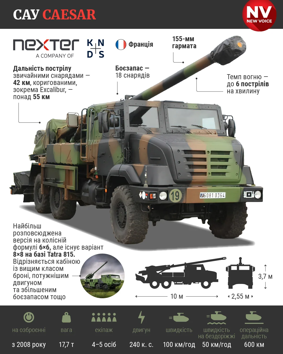 CAESAR — это французская 155-мм самоходная артиллерийская установка (САУ), предназначенная для уничтожения живой силы, артиллерийских батарей, дзотов, а также для обеспечения проходов в минных полях и полевых заграждениях. Главное преимущество «Цезарей» — высокая мобильность, большая дальность стрельбы, а также автоматическая система заряжания, что делает эти гаубицы одними из самых современных в мире. CAESAR установлена на шасси грузовика, максимальная дальность ее огня осколочно-фугасными снарядами — более 40 км, а активно-реактивными снарядами V-LAP, которые тоже используют ВСУ — до 50−55 км. Это значительно превышает возможности советского аналога Мста-С.