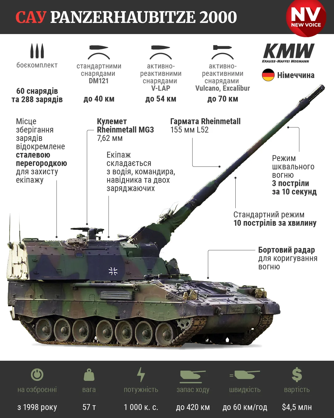 Самоходная немецкая гаубица PzH 2000 имеет гусеничное шасси, 155-мм орудие и одни из лучших характеристик в своем классе артиллерийских систем. Даже обычный снаряд летит из нее на расстояние 30−36 км, а «контрбатарейный» с улучшенной баллистикой — на расстояние до 40−47 км. Благодаря гусеничному ходу эта 56-тонная САУ может пройти по любым грунтам, она также способна делать выстрел автономно. «Хорошее современное оружие, сделанное с любовью к людям и целью выполнить боевую задачу. Победить быстро, точно, качественно, с большим спектром боеприпасов и высоким уровнем компьютеризации», — говорил об этой САУ в интервью УП полковник Олег Шевчук, командир 43-й отдельной артиллерийской бригады.