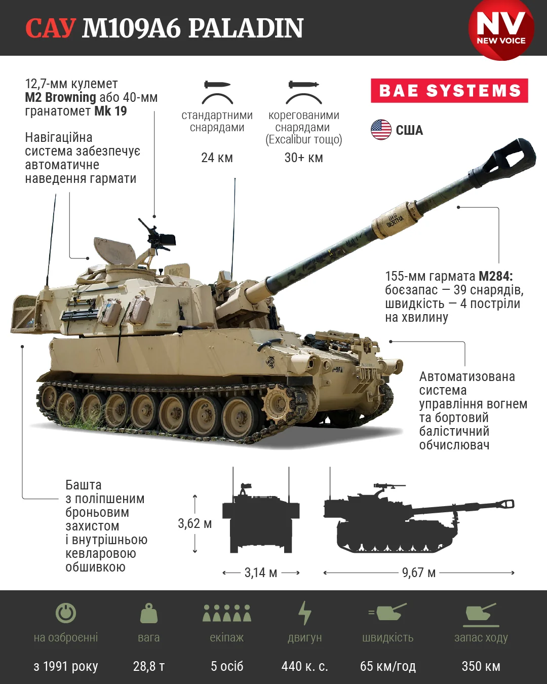 Американские самоходные артиллерийские установки M109 Paladin имеют гусеничный ход и оснащены 155-мм гаубицей М284, которая имеет дальность стрельбы до 24 км обычным снарядом и до 30 км активно-реактивным снарядом. Темп стрельбы — до 4 выстрелов в минуту. Особенность САУ Paladin модификации M109A6, которую США предоставляют Украине — интеграция цифровой навигационной системы и системы управления огнем в единую сеть управления. Это позволяет гаубице открыть точный огонь через 30 секунд после остановки, когда цифровая система берет на себя все необходимые расчеты по привязке и решению стрельбы, что значительно повышает ее эффективность. Башня САУ имеет улучшенную бронированную защиту и внутреннюю обшивку из кевлара. Машина также оборудована радиостанцией для защищенной связи. На видео ниже — рассказ украинского экипажа САУ Paladin о ее работе.