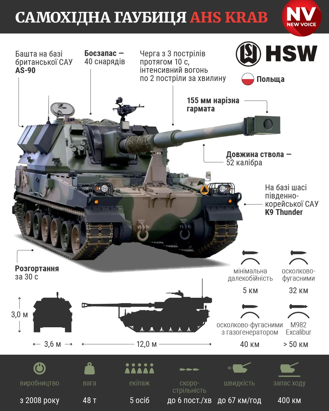 AHS Krab — польская самоходная артиллерийская установка (САУ) стандартного для НАТО калибра 155 мм. При производстве используется лицензионная башня от британской гаубицы AS-90. Экипаж боевой машины — 5 человек, вес — около 50 тонн. Время перехода гаубицы из походного в боевое положение составляет 30 секунд. По словам украинских военных, САУ «хорошо показала себя и в скорости наведения, и в дальности стрельбы». Об этом рассказал один из военнослужащих ВСУ в видео работы САУ Krab.