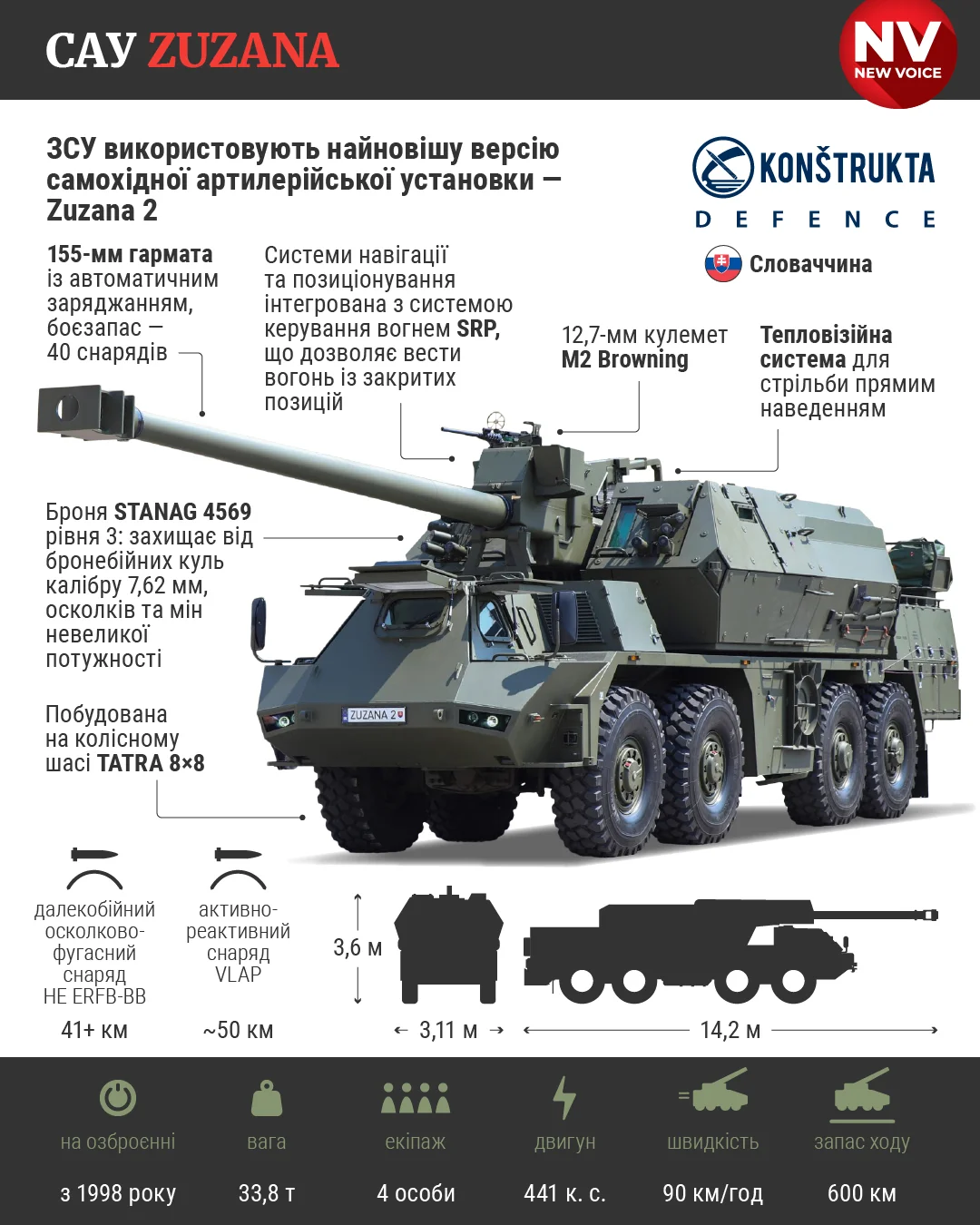 Zuzana 2 — самая новая версия этих гаубиц, которые производят в Словакии. Она базируется на колесном шасси TATRA 8×8, экипаж состоит из четырех человек. 155-мм орудие гаубицы заряжается автоматически, его боезапас — 40 снарядов. Скорость стрельбы в автоматическом режиме — 5 выстрелов в минуту или 13 выстрелов в течение трех минут. Скорость стрельбы в ручном режиме — 2 выстрела в минуту. САУ способна вести огонь с закрытых позиций, также оборудована тепловизионной системой для стрельбы прямой наводкой. Дальность стрельбы пушки Zuzana 2 — более 41 км дальнобойными осколочно-фугасными снарядами и около 50 км активно-реактивными снарядами VLAP.