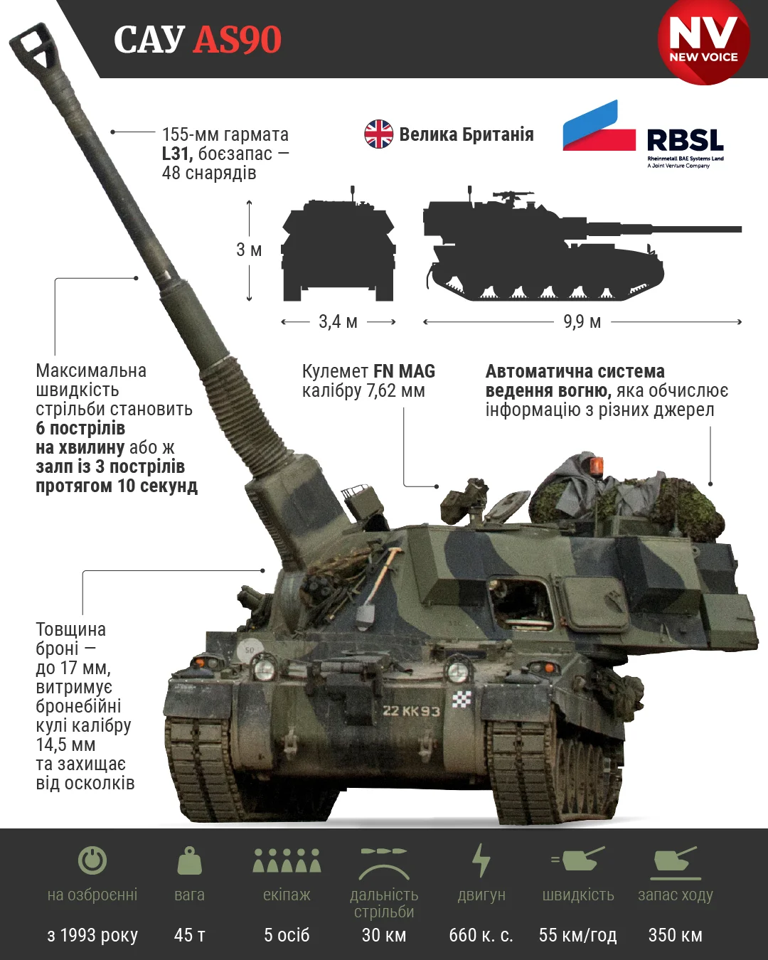 Передачу Украине этих британских 155-мм самоходных гаубиц Лондон впервые анонсировал в начале 2023 года. Самоходные артиллерийские установки AS-90 имеют экипаж в 5 человек. Обычными снарядами они способны стрелять на расстояние до 25−30 км, темп стрельбы — 3 выстрела за 10 секунд (очередь), 6 выстрелов за 3 минуты (интенсивный). Боекомплект — 48 снарядов. Дополнительное вооружение — 7,62 мм пулемет. Башня от AS-90 используется также в производстве польских САУ Krab, которые тоже используют Вооруженные силы Украины.