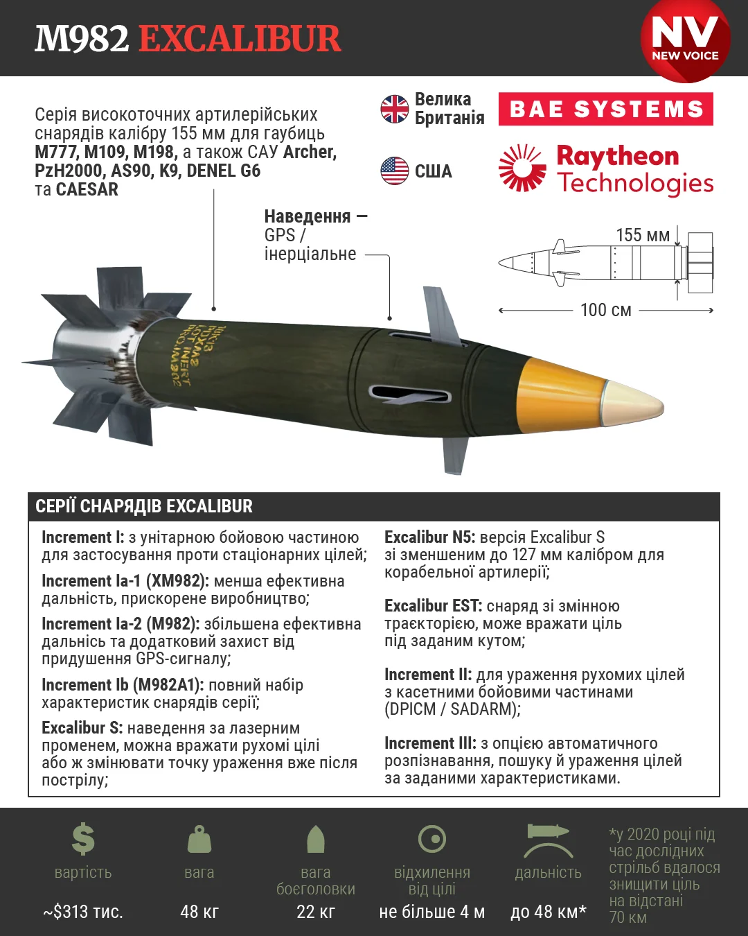 Эффективность орудий M777 значительно выше при использовании 155-мм управляемых активно-реактивных снарядов Excalibur, которые имеют увеличенную дальность полета (до 30−40 км).