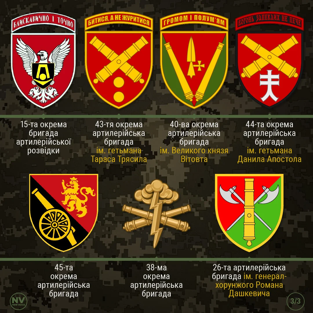 Артиллерийские части и подразделения в своем составе имеют как различные рода войск Вооруженных сил Украины, так и другие военные формирования Сил обороны, в частности это: