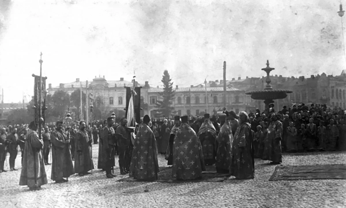 НЕБРИТЫЙ КЛИР: Богослужение на Софийской площади в Киеве по случаю провозглашения гетманата Павла Скоропадского 28 апреля 1918 года. Тогдашнее высшее духовенство было против автокефалии Украинской церкви и порицало стрижки и бритье священников. Фото: DR