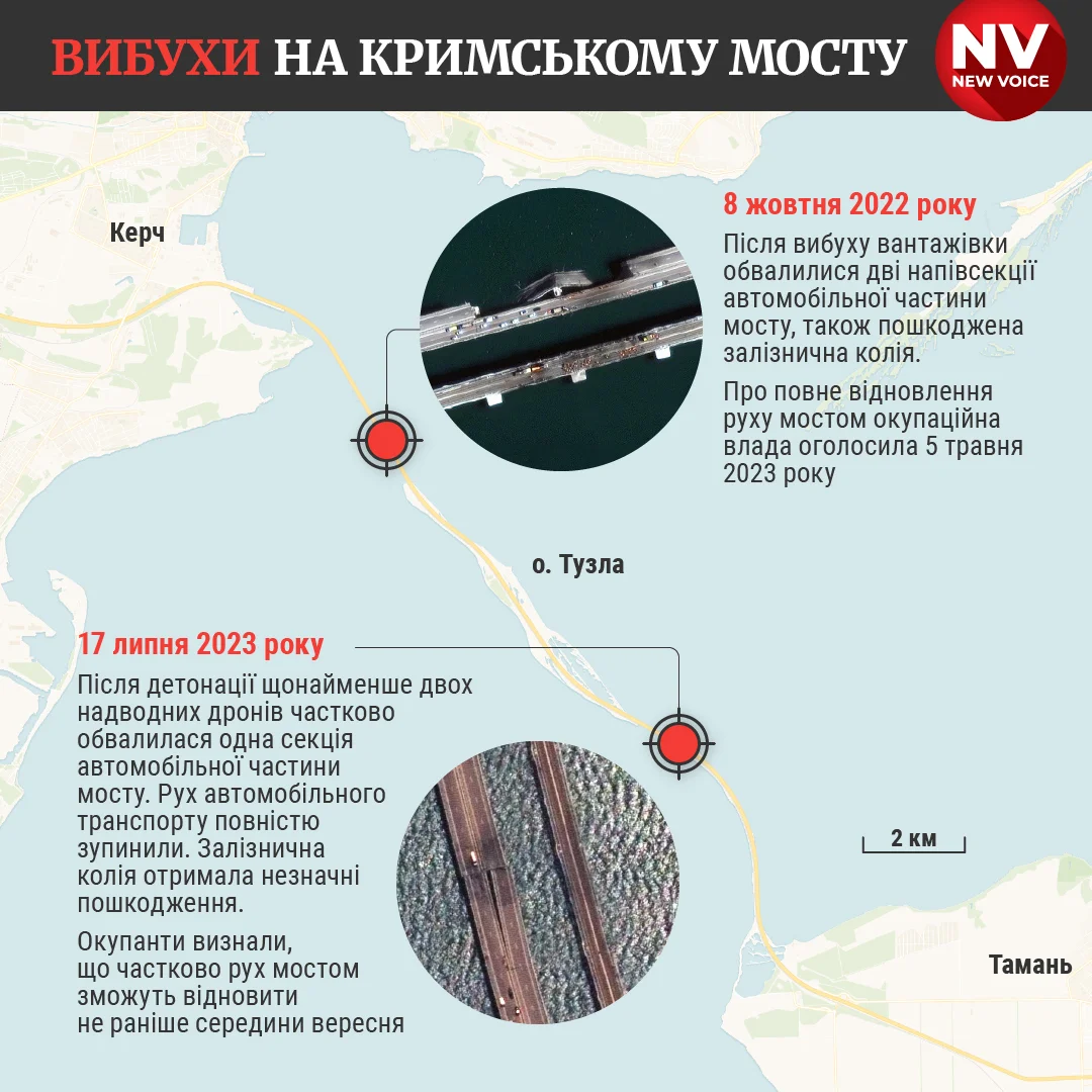 Это был уже второй случай взрывов на Крымском мосту, который Россия использует для переброски бронетехники и живой силы на юг Украины. 8 октября 2022 года в результате мощного взрыва рухнули несколько его пролетов.