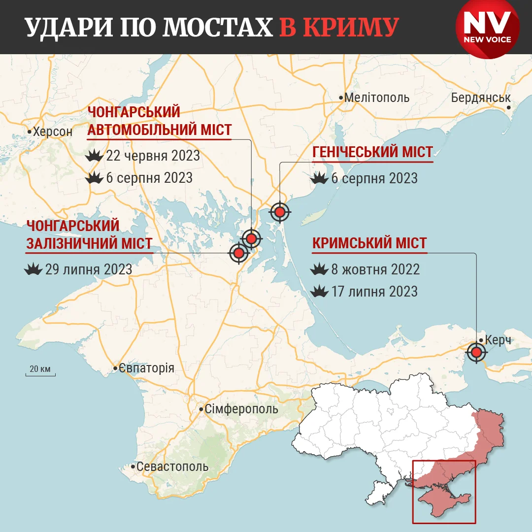В ночь на 17 июля на Крымском мосту прогремели взрывы, после чего все движение по нему было остановлено. Крымский гауляйтер Сергей Аксенов заявил о «чрезвычайном происшествии», а российские паблики писали о серьезном повреждении по меньшей мере одного пролета. Позже оккупанты сообщили о восстановлении железнодорожного сообщения.