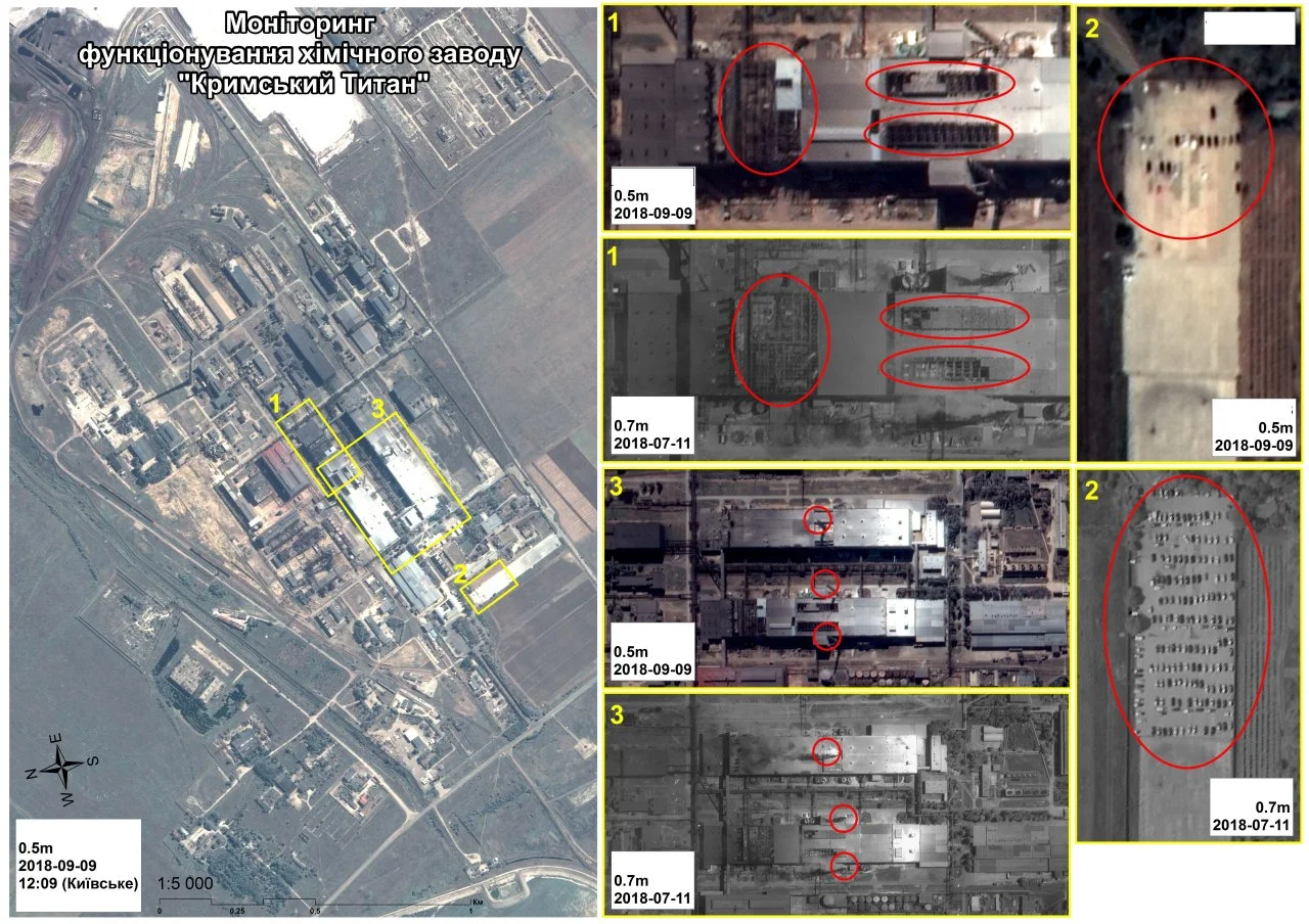 Министерство по делам временно оккупированных территорий опубликовало спутниковые снимки Крымского титана, на которых видны ремонтные работы на заводе.
