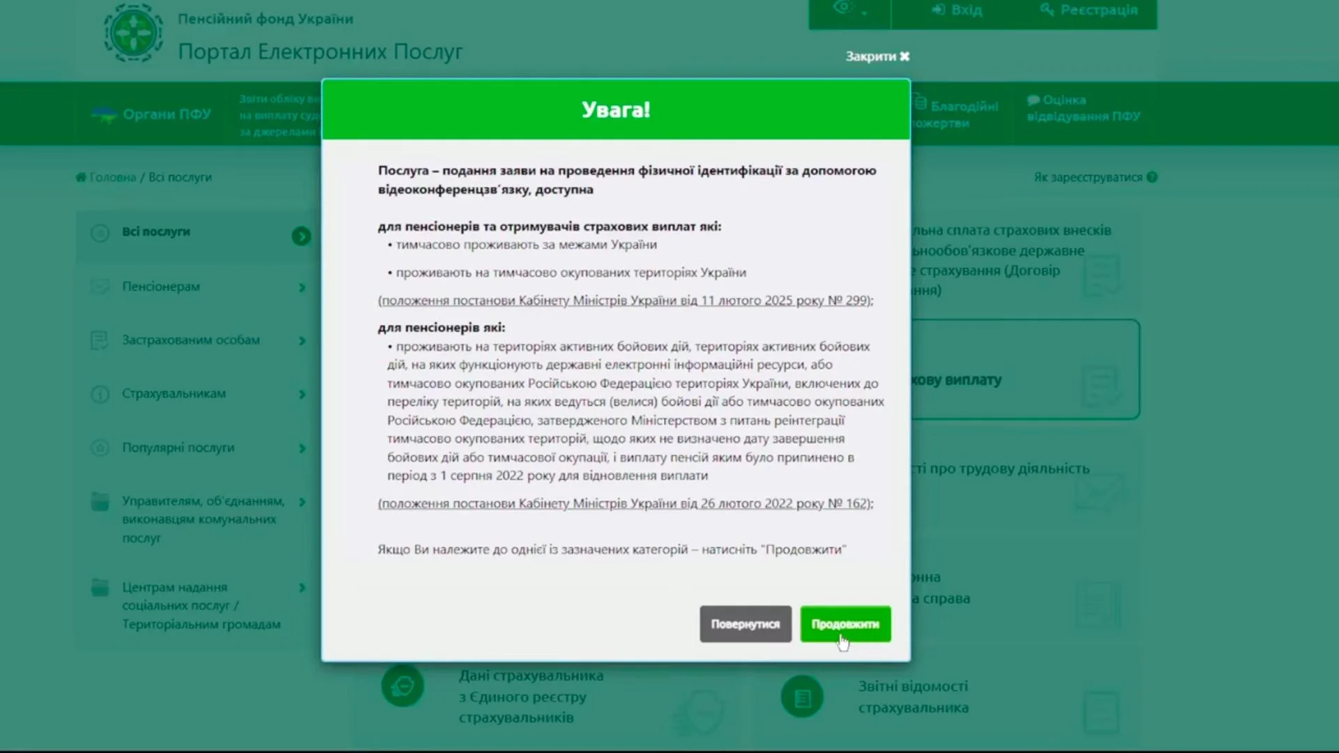 Пенсионеры и получатели страховых выплат, которые временно проживают за пределами Украины или проживают на временно оккупированных территориях Украины, должны проходить физическую идентификацию до 31 декабря каждого года.
