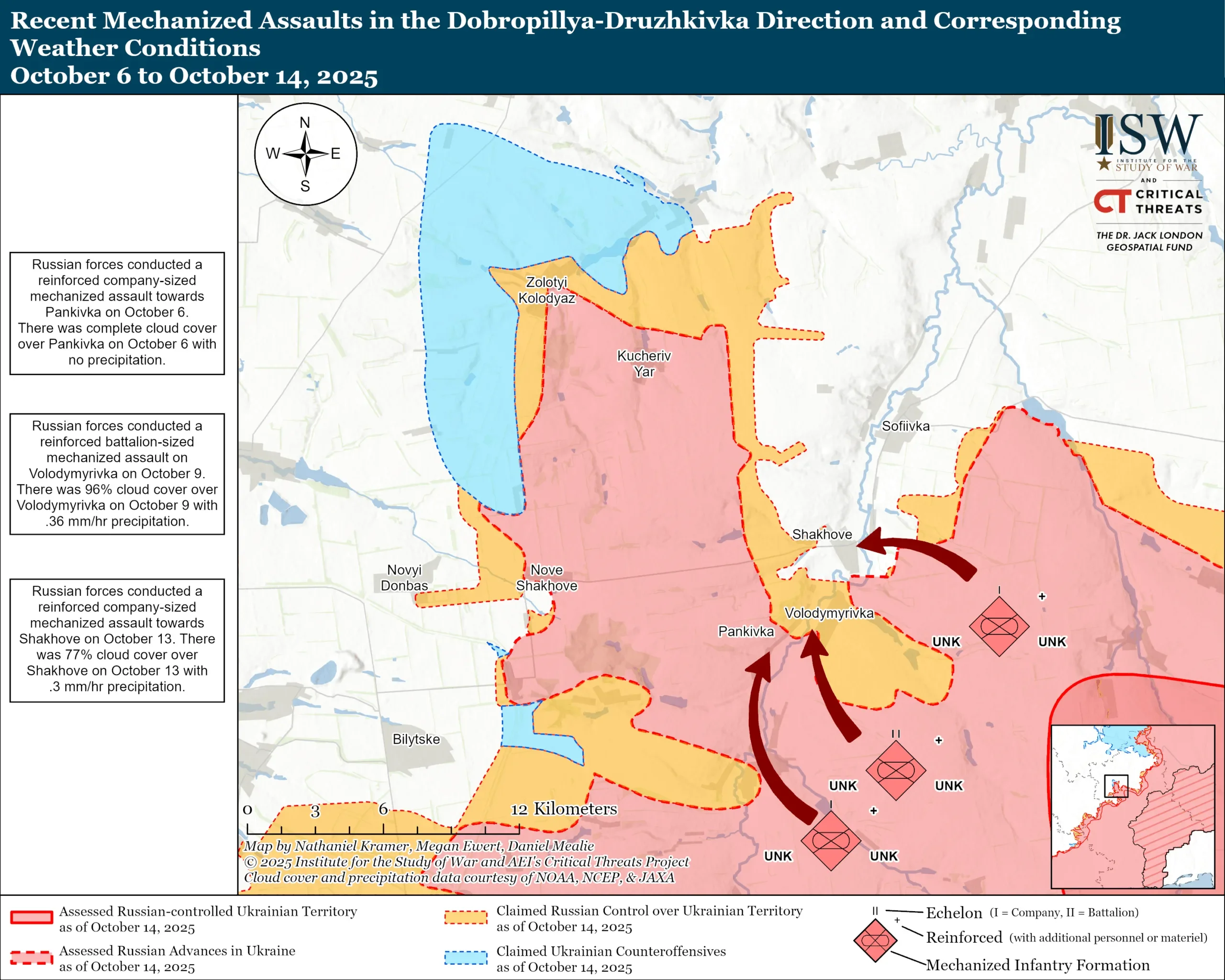 Со своей стороны, в ISW отмечают, что россияне, похоже, проводят масштабные механизированные атаки во время дождливой и туманной погоды, что затрудняет использование беспилотников для Сил обороны Украины. В частности, во время атак 6, 9 и 13 октября на участках атак были зафиксированы сильные или умеренные осадки, или же периоды облачной и туманной погоды. В ISW напоминают, что осенью 2025 года уже несколько украинских военных и OSINT-источниковписали о попытках российских войск использовать дождливые погодные условия, чтобы ограничить возможности работы украинских беспилотников.
