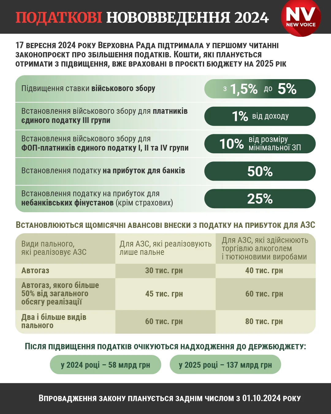 17 сентября Верховная Рада Украины приняла в первом чтении законопроект № 11416-д о повышении налогов. Как сообщил впоследствии народный депутат Ярослав Железняк, первый заместитель председателя комитета ВРУ по финансам, налоговой и таможенной политики, ожидается, что закон будет принят в целом только в октябре, однако его внедрение «будет „задним числом“ с 1 октября».