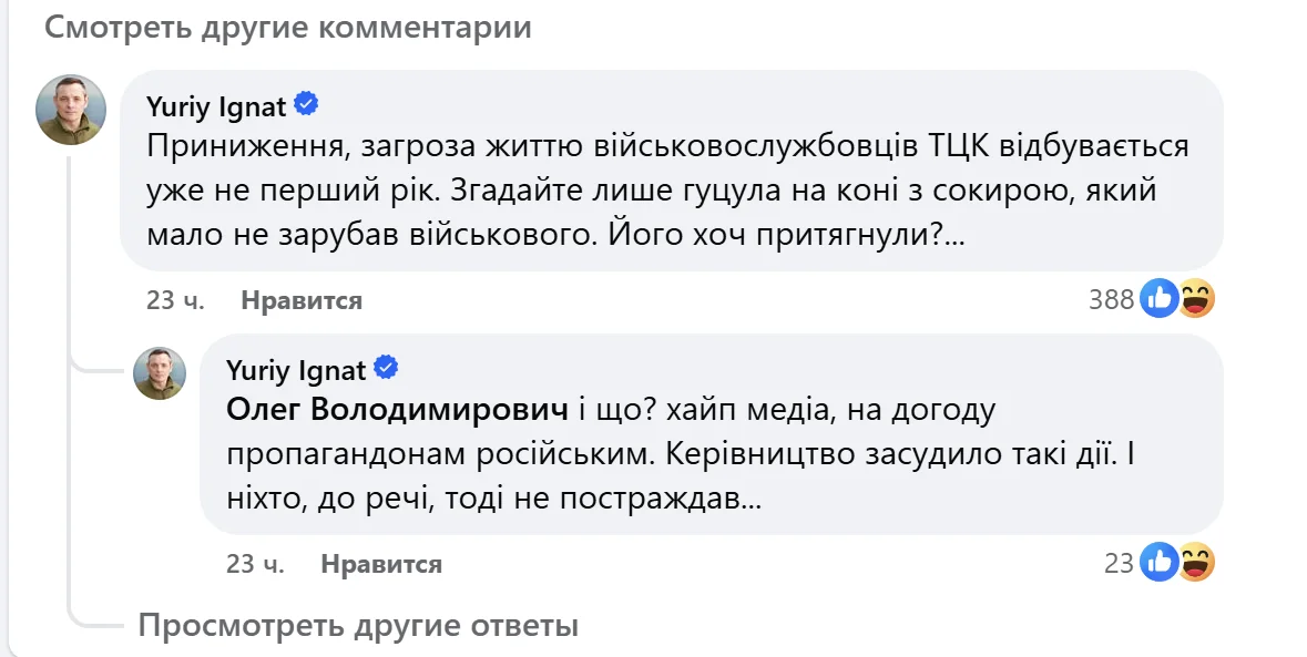 Юрий Игнат, начальник управления коммуникаций Командования Воздушных сил ВСУ, поддержал позицию Драпатого отдельным постом, а в комментариях под его публикацией констатировал, что «унижение, угроза жизни военнослужащих ТЦК происходит уже не первый год».