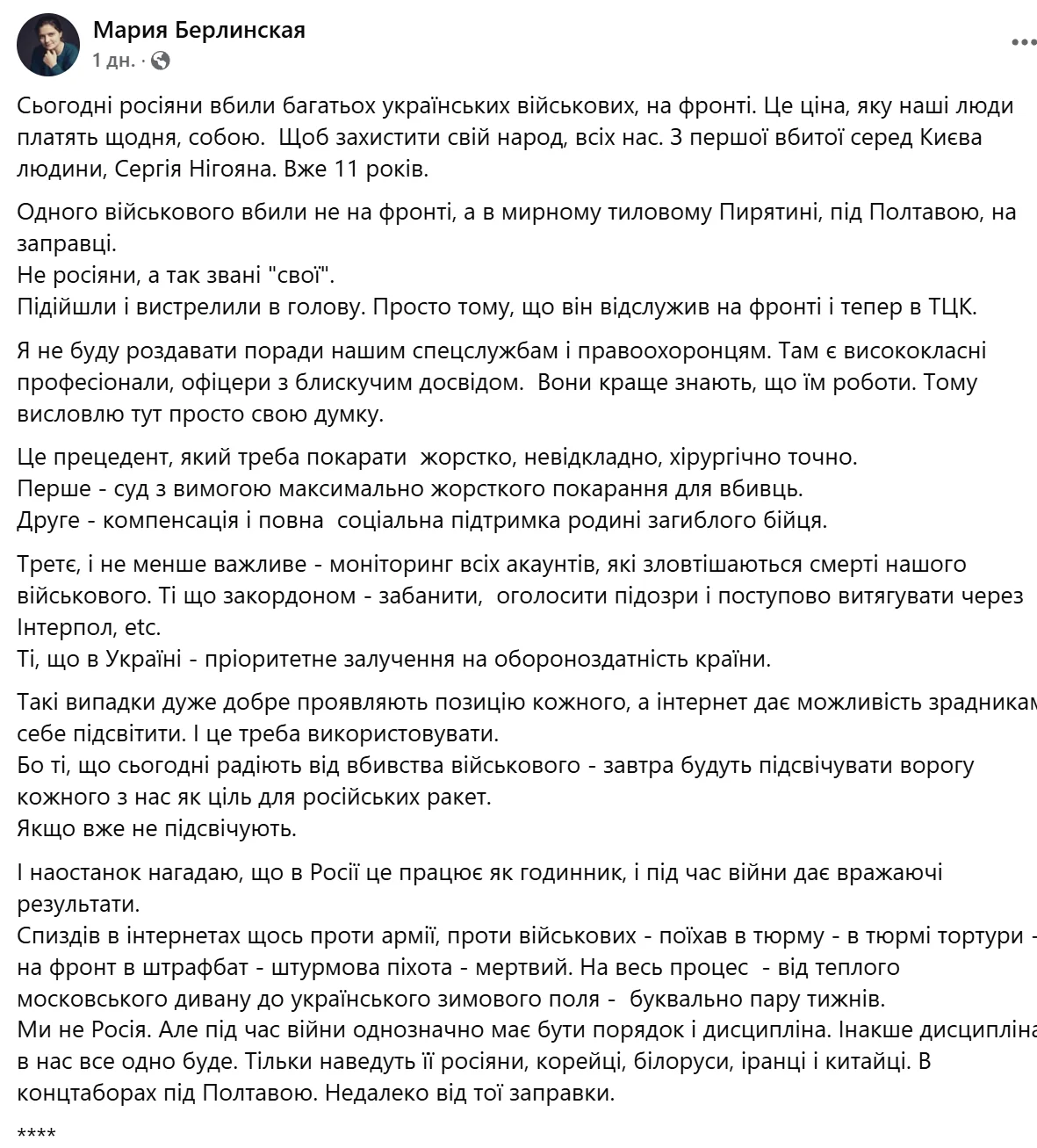 «Такие случаи очень хорошо проявляют позицию каждого, а интернет дает возможность предателям себя подсветить. И это надо использовать. Потому что те, кто сегодня радуются из-за убийства военного — завтра будут подсвечивать врагу каждого из нас как цель для российских ракет. Если уже не подсвечивают», — подчеркнула Берлинская.