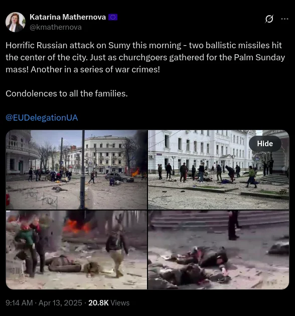 «Ужасная атака россиян на Сумы сегодня утром — две баллистические ракеты попали в центр города. Как раз собрались верующие на вербное воскресенье! Еще одно в серии военных преступлений! Соболезнования всем семьям», — написала Матернова на своей странице в соцсети X, опубликовав фото с места атаки.