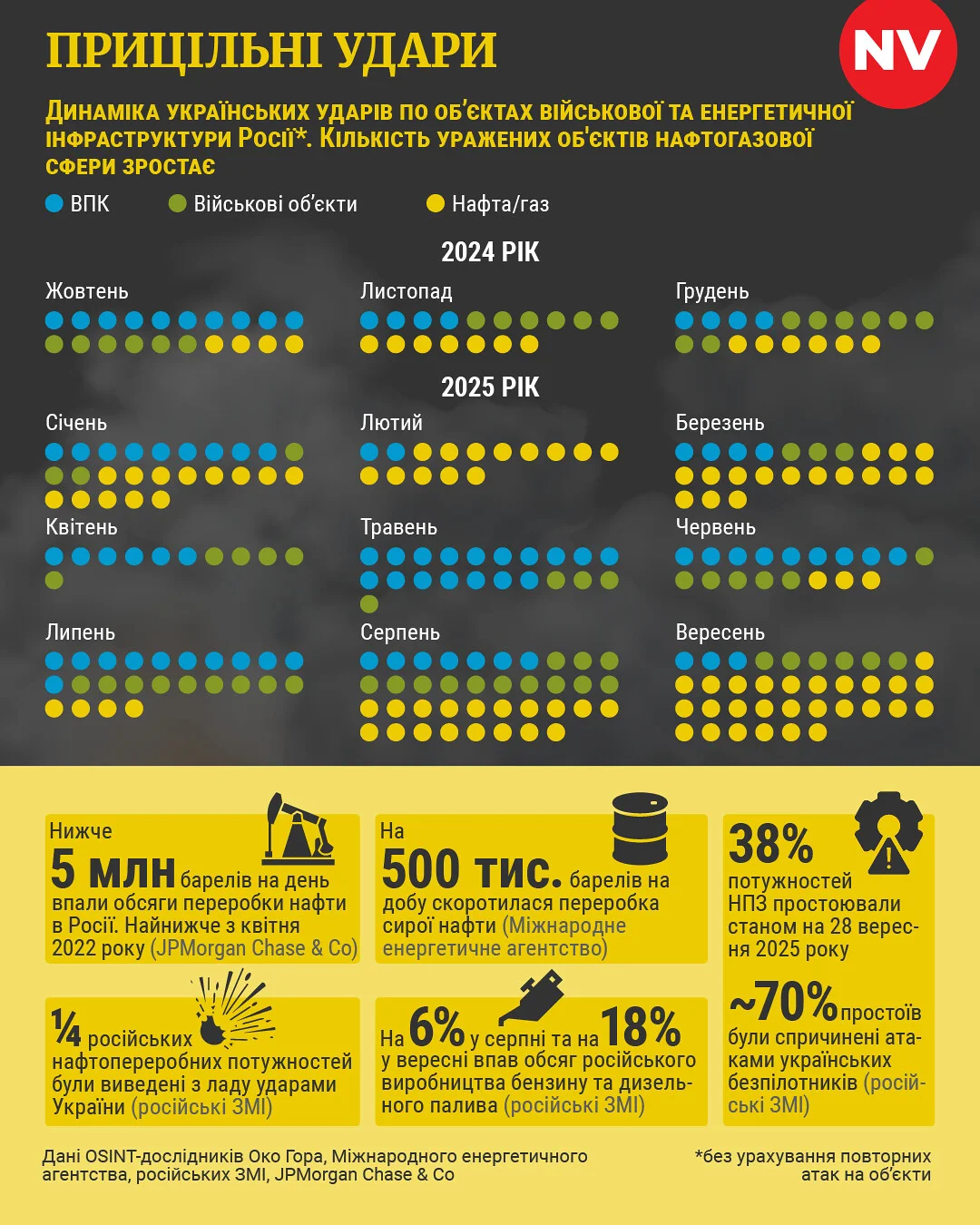За первые несколько месяцев 2025 года минимум 13 российских нефтеперерабатывающих заводов были повреждены, пишет автор. По состоянию на начало октября были повреждены минимум 21 из 38 крупнейших российских НПЗ, и примерно в то же время нефтеперерабатывающие мощности России сократились на 38%.