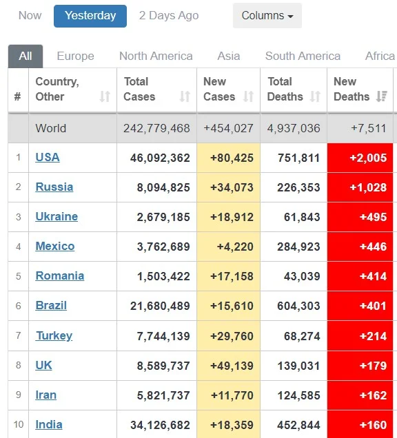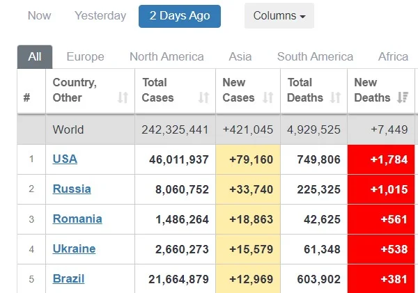 По данным статистического портала Worldometers, 19−20 октября Украина занимала 4-е и 3-е места в мире по числу смертей за сутки, пропуская вперед лишь США, Россию и Румынию. Число умерших в нашей стране в эти дни оказалось большим, чем в Индии, бывшем главном очаге штамма Дельта; Великобритании, где сейчас фиксируют более 40 тыс. новых случаев ежедневно; и Бразилии, где президента Жаира Болсонару могут официально обвинить в массовых убийствах из-за огромного общего числа умерших от COVID-19 (почти 604 тыс. смертей).