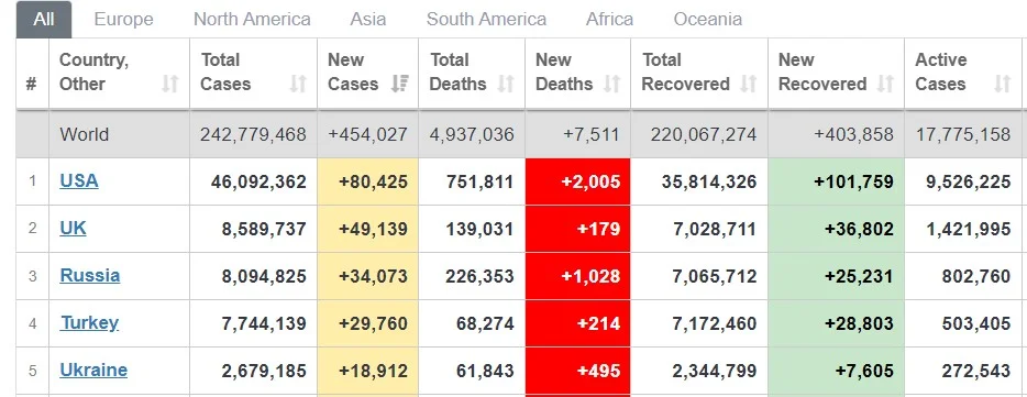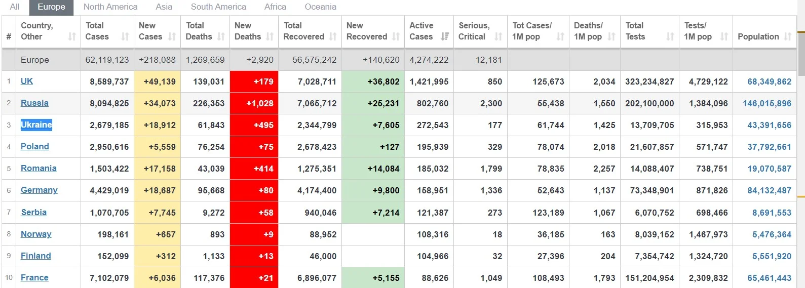 А по числу новых случаев 20 октября Украина оказалась на пятой строке в мире (после США, Великобритании, России и Турции) и на третьем месте в Европе (после Великобритании и России).