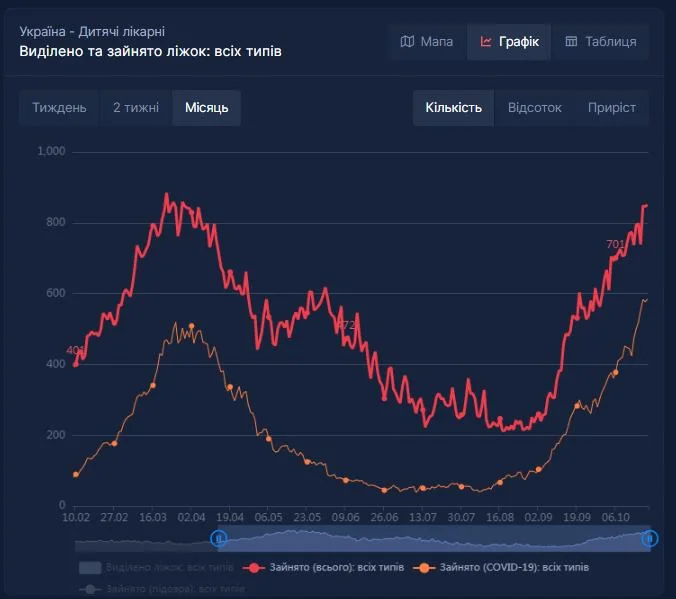 - рекордное заполнение детских больниц, превысившее максимум весны (по состоянию на 20 октября в украинских больницах был 851 ребенок с подтвержденным либо предполагаемым COVID-19) — больше всего детей госпитализированы в больницах Харьковской, Одесской и Днепропетровской областей;
