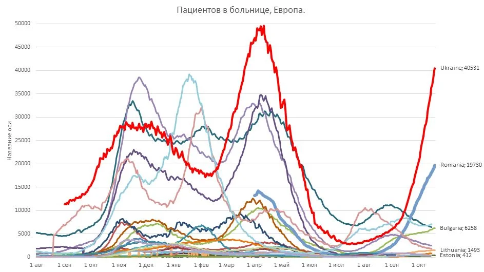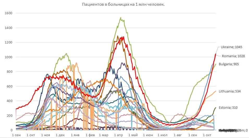 - рекордные по сравнению с европейскими странами показатели госпитализации в целом — к 20 октября Украина вышла на первое место в Европе по числу госпитализированных пациентов как в абсолютном измерении (40 531 пациентов) так и в относительном (1045 на 1 млн населения).