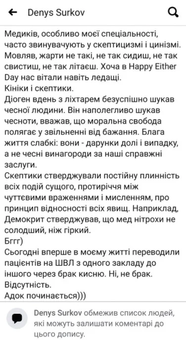 «Адок начинается», — констатировал эту же проблему 20 октября Денис Сурков, завотделением анестезиологии и интенсивной терапии для новорожденных Днепропетровской областной детской клинической больницы. «Сегодня впервые в моей жизни переводили пациентов на ИВЛ из одного учреждения в другое из-за нехватки кислорода. Нет, не нехватки. Отсутствия», — рассказал Сурков, уточнив позже, что речь шла не о его детской больнице, а о другом медучреждении.