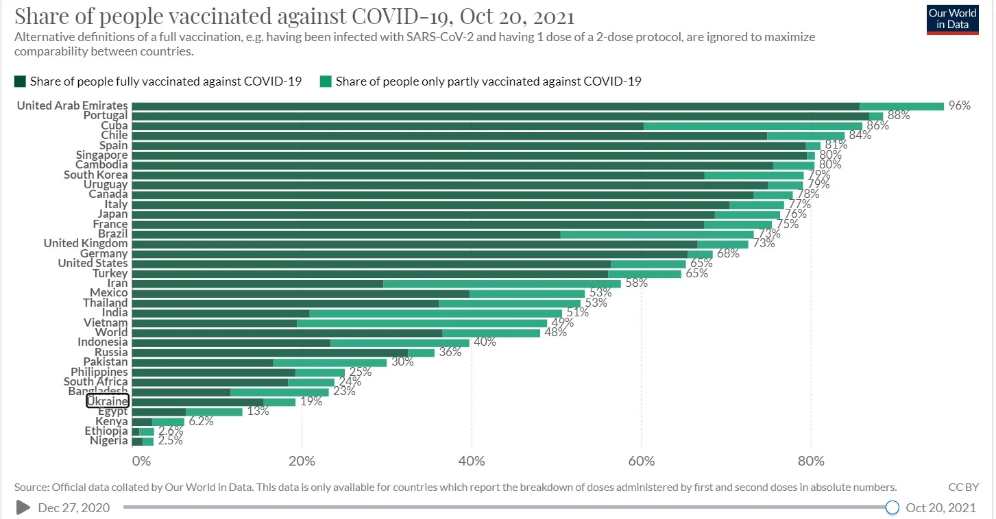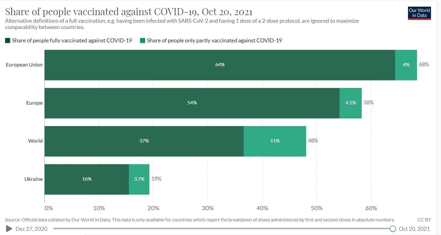 По данным портала Our world in data, в среднем в мире полностью вакцинированы 36,39% населения, а хотя бы одну дозу получили в общем 47,8% людей. В странах Европы эти цифры выше: 54% иммунизированы полностью, как минимум одну дозу получили почти 58% населения. В Украине же эти показатели достигают лишь 15,3% и 18,9% соответственно — с этим результатом страна занимает последнее место в Европе и 150-ю строку из более чем 200 стран и территорий в списке Our world in data.