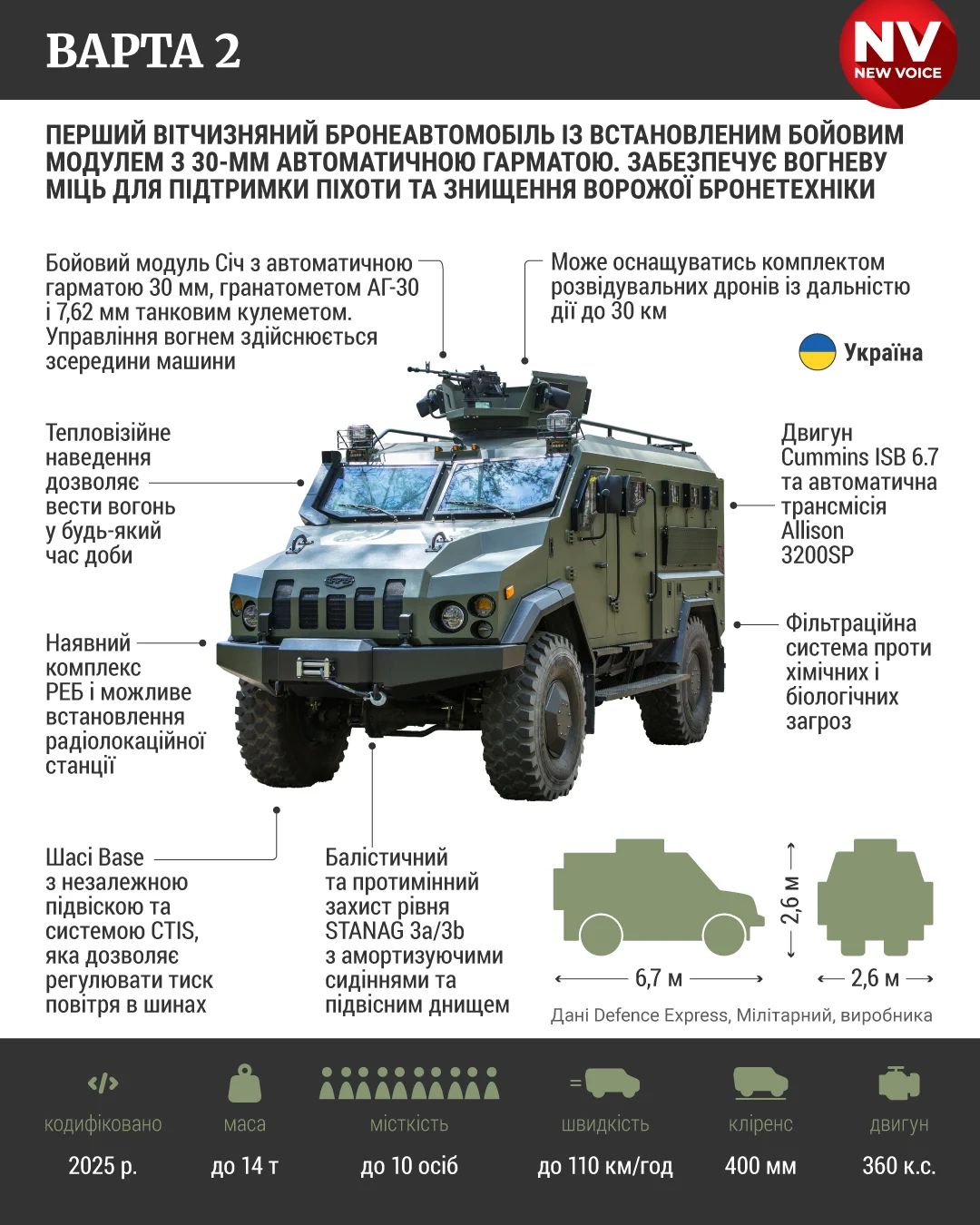 До 10 человек на борту и 30-мм орудие на крыше: новый украинский бронеавтомобиль Варта 2 в инфографике NV