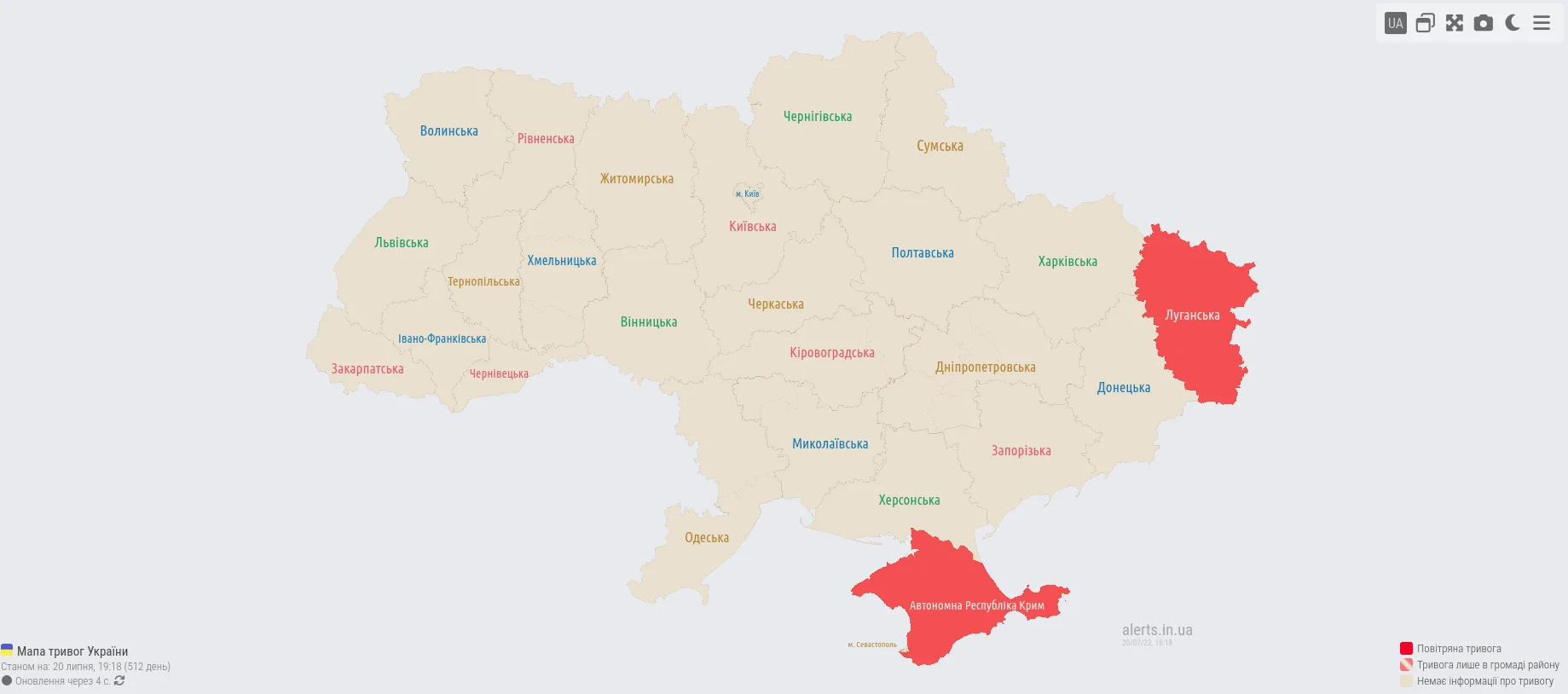 19:04 Воздушная тревога распространилась на всю территорию Украины