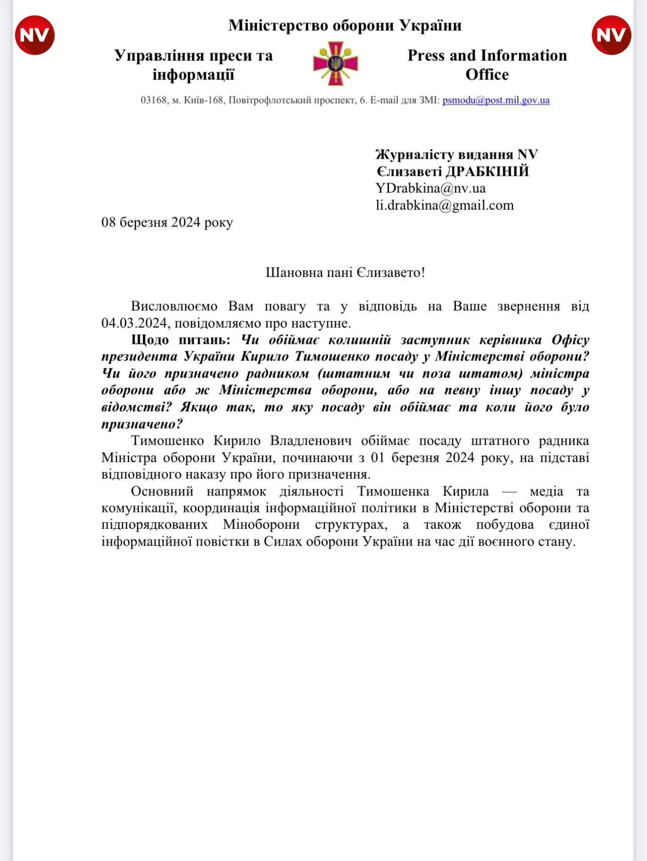 В пресс-службе МО на соответствующий запрос NV сообщили, что Тимошенко с 1 марта 2024 года занимает должность штатного советника министра обороны, — на основании соответствующего приказа о его назначении.