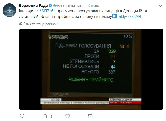 Ранее Верховная Рада в первом чтении проголосовала за законопроект президента Петра Порошенко №7163 Об особенностях государственной политики по обеспечению государственного суверенитета Украины над временно оккупированными территориями в Донецкой и Луганской областях.