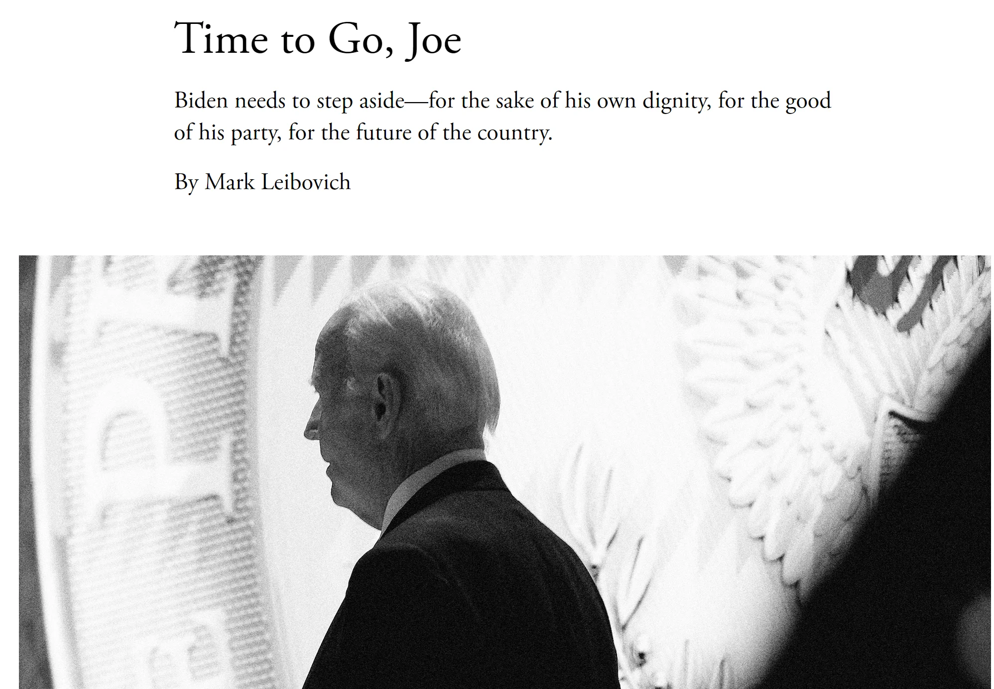 А известный в США либеральный сайт The Atlantic опубликовал полдюжины статей, в которых содержались призывы или аргументы за то, чтобы Байден уступил на выборах место другому демократу. «Пора уходить, Джо» — гласил заголовок одного из материалов, статья известного в США политического журналиста Марка Лейбовича, бывшего ведущего обозревателя NYT.