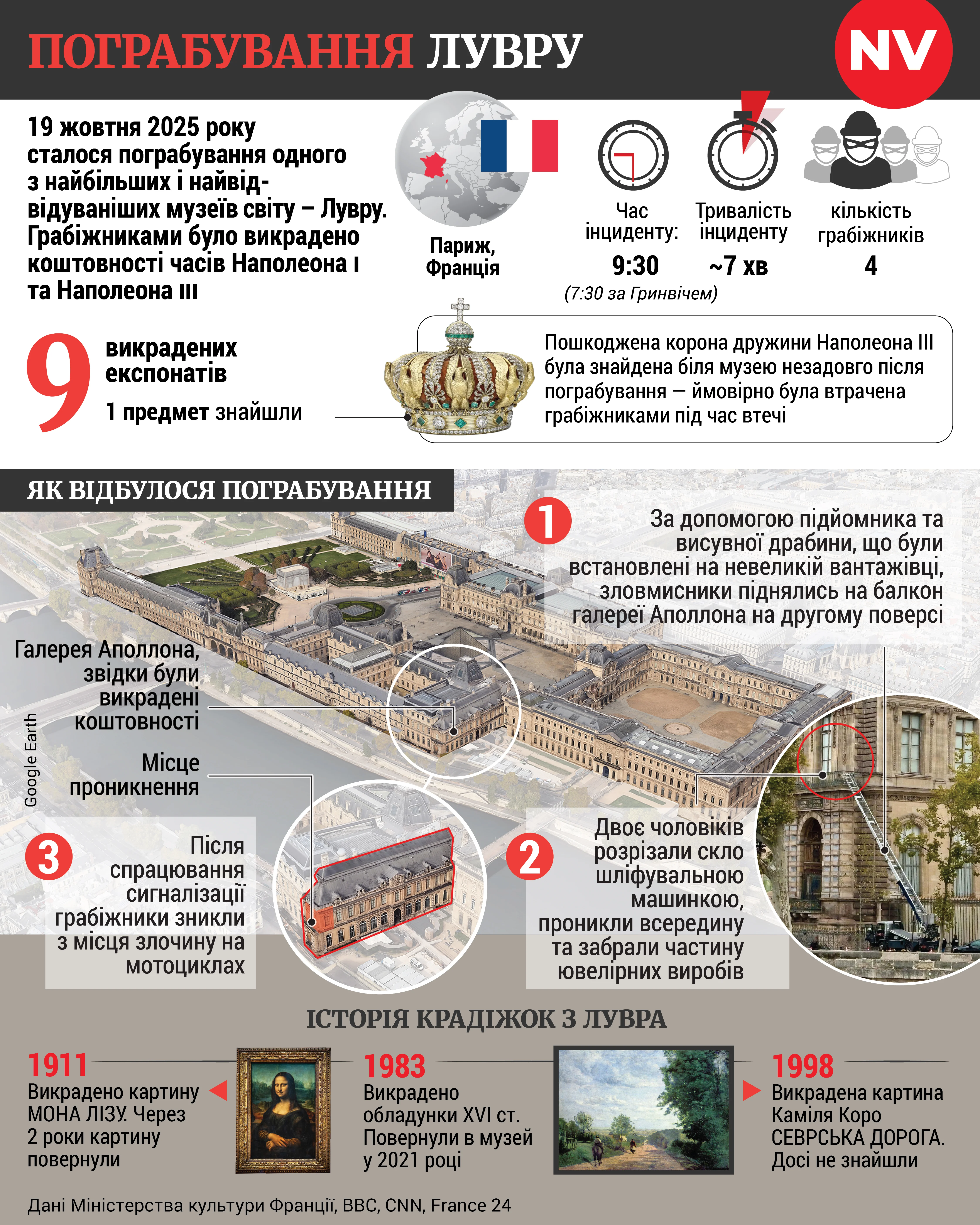 Грабителям удалось украсть девять ювелирных украшений и изделий, принадлежавших французским монархам. Один из украденных экспонатов уже был найден неподалеку Лувра: это «чрезвычайно ценная» корона французской императрицы Евгении (1853 — 1920), жены Наполеона III, которую злоумышленники вероятно потеряли во время побега.