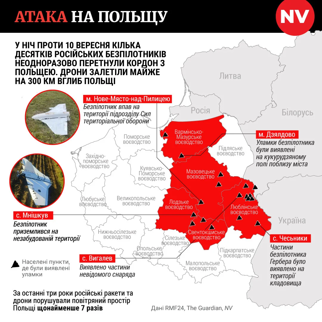 12 сентября польские власти уточнили, что атаку совершил 21 дрон. Сообщалось, что один из БпЛА упал на жилой дом в Люблинском воеводстве, но впоследствии СМИ сообщили, что повреждения могла вызвать ракета с польского F-16. По данным журналистов, дроны РФ, вероятно, летели атаковать логистический центр в Жешуве.