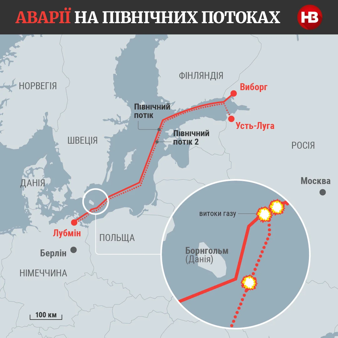 Всего было зафиксировано три мощных утечки. Профессор Шведского национального сейсмоцентра SNSN Бьерн Лунд заявил, что на маршрутах залегания трубопроводов произошли подводные взрывы — очевидно искусственной, а не геологической природы. Вероятно, они и стали причинами утечек. Теперь вокруг этого места видно огромное бурлящее «озеро», которое всему миру показали вооруженные силы Дании.