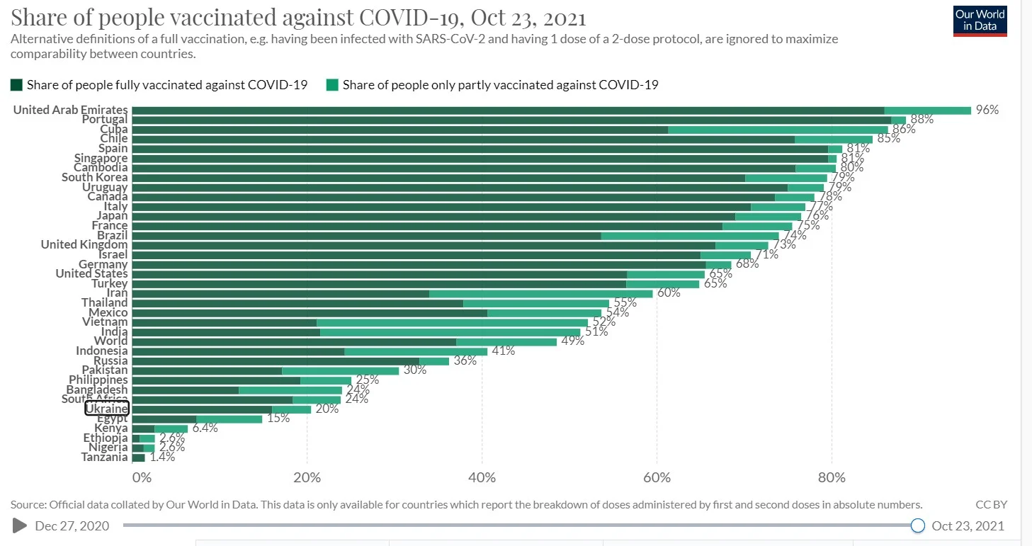 Напомним, по данным портала Our World in Data Украина занимает последнее место в Европе по уровню вакцинации населения (20,4% получили хотя бы одну дозу, полностью вакцинированы 16%).